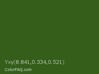 Yxy 8.841,0.334,0.521 Color is a dark green color and the nearest color is Dell #396413. Hex code #355e1b and RGB value is rgb(53,94,27). In RGB color space, this color is composed of 21% red, 37% green, 11% blue, In CMYK color space, this color is composed of 44% cyan, 0% magenta, 71% yellow , 63% black , In HSL color space, this color has a hue angle of 97° , 55% saturation and 24% lightness.