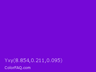 Yxy 8.854,0.211,0.095 Color is a normal purple color and the nearest color is French Violet #8806ce. Hex code #7508d7 and RGB value is rgb(117,8,215). In RGB color space, this color is composed of 46% red, 3% green, 84% blue, In CMYK color space, this color is composed of 46% cyan, 96% magenta, 0% yellow , 16% black , In HSL color space, this color has a hue angle of 272° , 93% saturation and 44% lightness.