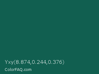 Yxy 8.874,0.244,0.376 Color is a very dark cyan color and the nearest color is Eden #105852. Hex code #115f50 and RGB value is rgb(17,95,80). In RGB color space, this color is composed of 7% red, 37% green, 31% blue, In CMYK color space, this color is composed of 82% cyan, 0% magenta, 16% yellow , 63% black , In HSL color space, this color has a hue angle of 168° , 70% saturation and 22% lightness.