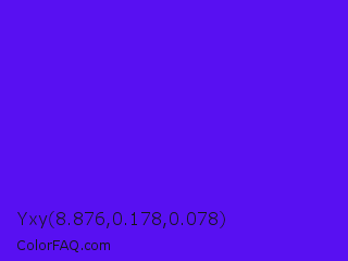 Yxy 8.876,0.178,0.078 Color is a normal indigo color and the nearest color is Han Purple #5218fa. Hex code #5810f2 and RGB value is rgb(88,16,242). In RGB color space, this color is composed of 35% red, 6% green, 95% blue, In CMYK color space, this color is composed of 64% cyan, 93% magenta, 0% yellow , 5% black , In HSL color space, this color has a hue angle of 259° , 90% saturation and 51% lightness.