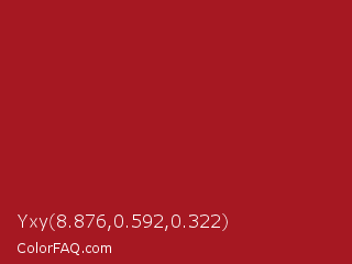 Yxy 8.876,0.592,0.322 Color is a normal red color and the nearest color is Upsdell Red #ae2029. Hex code #a61822 and RGB value is rgb(166,24,34). In RGB color space, this color is composed of 65% red, 9% green, 13% blue, In CMYK color space, this color is composed of 0% cyan, 86% magenta, 80% yellow , 35% black , In HSL color space, this color has a hue angle of 356° , 75% saturation and 37% lightness.