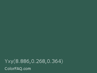 Yxy 8.886,0.268,0.364 Color is a dark green color and the nearest color is Stromboli #325d52. Hex code #315c50 and RGB value is rgb(49,92,80). In RGB color space, this color is composed of 19% red, 36% green, 31% blue, In CMYK color space, this color is composed of 47% cyan, 0% magenta, 13% yellow , 64% black , In HSL color space, this color has a hue angle of 163° , 30% saturation and 28% lightness.