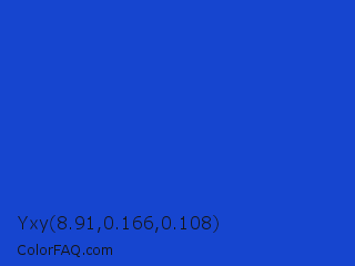 Yxy 8.91,0.166,0.108 Color is a normal blue color and the nearest color is New Car #214fc6. Hex code #1645cf and RGB value is rgb(22,69,207). In RGB color space, this color is composed of 9% red, 27% green, 81% blue, In CMYK color space, this color is composed of 89% cyan, 67% magenta, 0% yellow , 19% black , In HSL color space, this color has a hue angle of 225° , 81% saturation and 45% lightness.