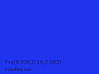 Yxy 8.936,0.16,0.083 Color is a normal blue color and the nearest color is Palatinate Blue #273be2. Hex code #2034ee and RGB value is rgb(32,52,238). In RGB color space, this color is composed of 13% red, 20% green, 93% blue, In CMYK color space, this color is composed of 87% cyan, 78% magenta, 0% yellow , 7% black , In HSL color space, this color has a hue angle of 234° , 86% saturation and 53% lightness.