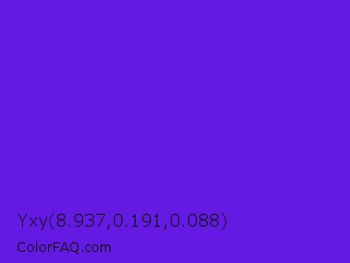 Yxy 8.937,0.191,0.088 Color is a normal violet color and the nearest color is Han Purple #5218fa. Hex code #641ae3 and RGB value is rgb(100,26,227). In RGB color space, this color is composed of 39% red, 10% green, 89% blue, In CMYK color space, this color is composed of 56% cyan, 89% magenta, 0% yellow , 11% black , In HSL color space, this color has a hue angle of 262° , 79% saturation and 50% lightness.