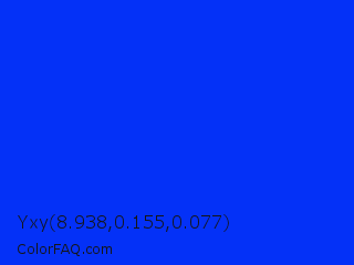 Yxy 8.938,0.155,0.077 Color is a normal blue color and the nearest color is Blue RYB #0247fe. Hex code #0431f7 and RGB value is rgb(4,49,247). In RGB color space, this color is composed of 2% red, 19% green, 97% blue, In CMYK color space, this color is composed of 98% cyan, 80% magenta, 0% yellow , 3% black , In HSL color space, this color has a hue angle of 229° , 97% saturation and 49% lightness.