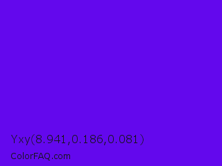 Yxy 8.941,0.186,0.081 Color is a normal violet color and the nearest color is Electric Indigo #6f00ff. Hex code #6308ed and RGB value is rgb(99,8,237). In RGB color space, this color is composed of 39% red, 3% green, 93% blue, In CMYK color space, this color is composed of 58% cyan, 97% magenta, 0% yellow , 7% black , In HSL color space, this color has a hue angle of 264° , 93% saturation and 48% lightness.