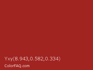 Yxy 8.943,0.582,0.334 Color is a normal red color and the nearest color is Mexican Red #a72525. Hex code #a12420 and RGB value is rgb(161,36,32). In RGB color space, this color is composed of 63% red, 14% green, 13% blue, In CMYK color space, this color is composed of 0% cyan, 78% magenta, 80% yellow , 37% black , In HSL color space, this color has a hue angle of 2° , 67% saturation and 38% lightness.