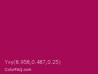 Yxy 8.958,0.487,0.25 Color is a normal rose color and the nearest color is Jazzberry Jam #a50b5e. Hex code #a60955 and RGB value is rgb(166,9,85). In RGB color space, this color is composed of 65% red, 4% green, 33% blue, In CMYK color space, this color is composed of 0% cyan, 95% magenta, 49% yellow , 35% black , In HSL color space, this color has a hue angle of 331° , 90% saturation and 34% lightness.