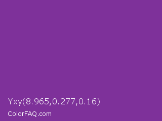 Yxy 8.965,0.277,0.16 Color is a normal purple color and the nearest color is Vivid Violet #803790. Hex code #7e319a and RGB value is rgb(126,49,154). In RGB color space, this color is composed of 49% red, 19% green, 60% blue, In CMYK color space, this color is composed of 18% cyan, 68% magenta, 0% yellow , 40% black , In HSL color space, this color has a hue angle of 284° , 52% saturation and 40% lightness.
