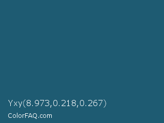 Yxy 8.973,0.218,0.267 Color is a dark blue color and the nearest color is Blumine #18587a. Hex code #1e5b72 and RGB value is rgb(30,91,114). In RGB color space, this color is composed of 12% red, 36% green, 45% blue, In CMYK color space, this color is composed of 74% cyan, 20% magenta, 0% yellow , 55% black , In HSL color space, this color has a hue angle of 196° , 58% saturation and 28% lightness.