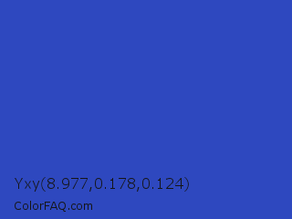 Yxy 8.977,0.178,0.124 Color is a normal blue color and the nearest color is Cerulean Blue #2a52be. Hex code #2e48bf and RGB value is rgb(46,72,191). In RGB color space, this color is composed of 18% red, 28% green, 75% blue, In CMYK color space, this color is composed of 76% cyan, 62% magenta, 0% yellow , 25% black , In HSL color space, this color has a hue angle of 229° , 61% saturation and 46% lightness.
