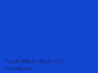 Yxy 8.988,0.165,0.107 Color is a normal blue color and the nearest color is New Car #214fc6. Hex code #1245d1 and RGB value is rgb(18,69,209). In RGB color space, this color is composed of 7% red, 27% green, 82% blue, In CMYK color space, this color is composed of 91% cyan, 67% magenta, 0% yellow , 18% black , In HSL color space, this color has a hue angle of 224° , 84% saturation and 45% lightness.