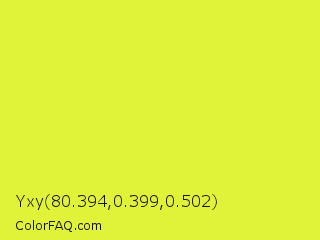 Yxy 80.394,0.399,0.502 Color is a normal yellow color and the nearest color is Starship #ecf245. Hex code #e1f338 and RGB value is rgb(225,243,56). In RGB color space, this color is composed of 88% red, 95% green, 22% blue, In CMYK color space, this color is composed of 7% cyan, 0% magenta, 77% yellow , 5% black , In HSL color space, this color has a hue angle of 66° , 89% saturation and 59% lightness.