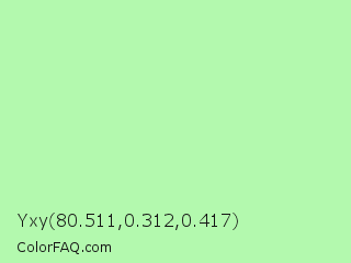 Yxy 80.511,0.312,0.417 Color is a very light green color and the nearest color is Madang #b7f0be. Hex code #b3f9ae and RGB value is rgb(179,249,174). In RGB color space, this color is composed of 70% red, 98% green, 68% blue, In CMYK color space, this color is composed of 28% cyan, 0% magenta, 30% yellow , 2% black , In HSL color space, this color has a hue angle of 116° , 86% saturation and 83% lightness.