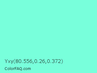Yxy 80.556,0.26,0.372 Color is a light cyan color and the nearest color is Aquamarine #7fffd4. Hex code #78ffdb and RGB value is rgb(120,255,219). In RGB color space, this color is composed of 47% red, 100% green, 86% blue, In CMYK color space, this color is composed of 53% cyan, 0% magenta, 14% yellow , 0% black , In HSL color space, this color has a hue angle of 164° , 100% saturation and 74% lightness.