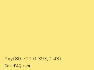 Yxy 80.799,0.393,0.43 Color is a light yellow color and the nearest color is Yellow Crayola #fce883. Hex code #fde983 and RGB value is rgb(253,233,131). In RGB color space, this color is composed of 99% red, 91% green, 51% blue, In CMYK color space, this color is composed of 0% cyan, 8% magenta, 48% yellow , 1% black , In HSL color space, this color has a hue angle of 50° , 97% saturation and 75% lightness.