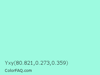Yxy 80.821,0.273,0.359 Color is a light green color and the nearest color is Water Leaf #a1e9de. Hex code #9dfae0 and RGB value is rgb(157,250,224). In RGB color space, this color is composed of 62% red, 98% green, 88% blue, In CMYK color space, this color is composed of 37% cyan, 0% magenta, 10% yellow , 2% black , In HSL color space, this color has a hue angle of 163° , 90% saturation and 80% lightness.
