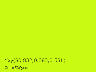Yxy 80.832,0.383,0.531 Color is a normal lime color and the nearest color is Arctic Lime #d0ff14. Hex code #c9fa12 and RGB value is rgb(201,250,18). In RGB color space, this color is composed of 79% red, 98% green, 7% blue, In CMYK color space, this color is composed of 20% cyan, 0% magenta, 93% yellow , 2% black , In HSL color space, this color has a hue angle of 73° , 96% saturation and 53% lightness.