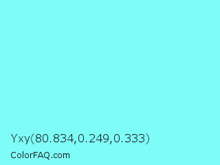Yxy 80.834,0.249,0.333 Color is a light cyan color and the nearest color is Electric Blue #7df9ff. Hex code #7efcf8 and RGB value is rgb(126,252,248). In RGB color space, this color is composed of 49% red, 99% green, 97% blue, In CMYK color space, this color is composed of 50% cyan, 0% magenta, 2% yellow , 1% black , In HSL color space, this color has a hue angle of 178° , 95% saturation and 74% lightness.