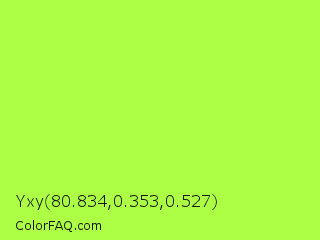 Yxy 80.834,0.353,0.527 Color is a light green color and the nearest color is French Lime #9efd38. Hex code #adff45 and RGB value is rgb(173,255,69). In RGB color space, this color is composed of 68% red, 100% green, 27% blue, In CMYK color space, this color is composed of 32% cyan, 0% magenta, 73% yellow , 0% black , In HSL color space, this color has a hue angle of 86° , 100% saturation and 64% lightness.