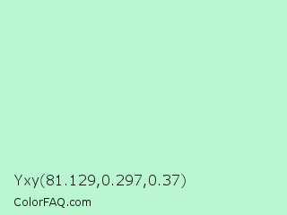 Yxy 81.129,0.297,0.37 Color is a very light green color and the nearest color is Cruise #b5ecdf. Hex code #bbf6d2 and RGB value is rgb(187,246,210). In RGB color space, this color is composed of 73% red, 96% green, 82% blue, In CMYK color space, this color is composed of 24% cyan, 0% magenta, 15% yellow , 4% black , In HSL color space, this color has a hue angle of 143° , 77% saturation and 85% lightness.