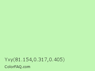 Yxy 81.154,0.317,0.405 Color is a very light green color and the nearest color is Madang #b7f0be. Hex code #c1f7b4 and RGB value is rgb(193,247,180). In RGB color space, this color is composed of 76% red, 97% green, 71% blue, In CMYK color space, this color is composed of 22% cyan, 0% magenta, 27% yellow , 3% black , In HSL color space, this color has a hue angle of 108° , 81% saturation and 84% lightness.