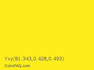 Yxy 81.343,0.428,0.493 Color is a normal yellow color and the nearest color is Broom #ffec13. Hex code #fced1b and RGB value is rgb(252,237,27). In RGB color space, this color is composed of 99% red, 93% green, 11% blue, In CMYK color space, this color is composed of 0% cyan, 6% magenta, 89% yellow , 1% black , In HSL color space, this color has a hue angle of 56° , 97% saturation and 55% lightness.