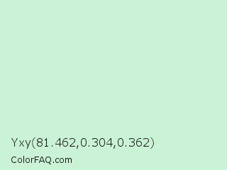 Yxy 81.462,0.304,0.362 Color is a very light green color and the nearest color is Blue Romance #d2f6de. Hex code #caf3d5 and RGB value is rgb(202,243,213). In RGB color space, this color is composed of 79% red, 95% green, 84% blue, In CMYK color space, this color is composed of 17% cyan, 0% magenta, 12% yellow , 5% black , In HSL color space, this color has a hue angle of 136° , 63% saturation and 87% lightness.