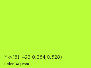 Yxy 81.493,0.364,0.528 Color is a light green color and the nearest color is Green Yellow #adff2f. Hex code #b9fe39 and RGB value is rgb(185,254,57). In RGB color space, this color is composed of 73% red, 100% green, 22% blue, In CMYK color space, this color is composed of 27% cyan, 0% magenta, 78% yellow , 0% black , In HSL color space, this color has a hue angle of 81° , 99% saturation and 61% lightness.