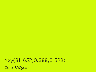 Yxy 81.652,0.388,0.529 Color is a normal lime color and the nearest color is Volt #ceff00. Hex code #cffa07 and RGB value is rgb(207,250,7). In RGB color space, this color is composed of 81% red, 98% green, 3% blue, In CMYK color space, this color is composed of 17% cyan, 0% magenta, 97% yellow , 2% black , In HSL color space, this color has a hue angle of 71° , 96% saturation and 50% lightness.