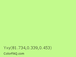 Yxy 81.734,0.339,0.453 Color is a light green color and the nearest color is Sulu #c1f07c. Hex code #c2fa8c and RGB value is rgb(194,250,140). In RGB color space, this color is composed of 76% red, 98% green, 55% blue, In CMYK color space, this color is composed of 22% cyan, 0% magenta, 44% yellow , 2% black , In HSL color space, this color has a hue angle of 91° , 92% saturation and 76% lightness.