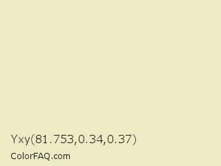 Yxy 81.753,0.34,0.37 Color is a very light yellow color and the nearest color is Mint Julep #f1eec1. Hex code #eeebc4 and RGB value is rgb(238,235,196). In RGB color space, this color is composed of 93% red, 92% green, 77% blue, In CMYK color space, this color is composed of 0% cyan, 1% magenta, 18% yellow , 7% black , In HSL color space, this color has a hue angle of 56° , 55% saturation and 85% lightness.