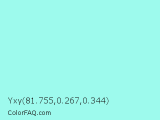 Yxy 81.755,0.267,0.344 Color is a light cyan color and the nearest color is Waterspout #a4f4f9. Hex code #9dfaed and RGB value is rgb(157,250,237). In RGB color space, this color is composed of 62% red, 98% green, 93% blue, In CMYK color space, this color is composed of 37% cyan, 0% magenta, 5% yellow , 2% black , In HSL color space, this color has a hue angle of 172° , 90% saturation and 80% lightness.
