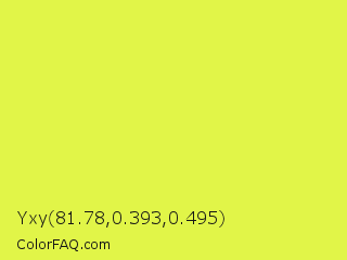 Yxy 81.78,0.393,0.495 Color is a light yellow color and the nearest color is Starship #ecf245. Hex code #e1f548 and RGB value is rgb(225,245,72). In RGB color space, this color is composed of 88% red, 96% green, 28% blue, In CMYK color space, this color is composed of 8% cyan, 0% magenta, 71% yellow , 4% black , In HSL color space, this color has a hue angle of 67° , 90% saturation and 62% lightness.