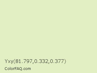 Yxy 81.797,0.332,0.377 Color is a very light lime color and the nearest color is Beryl Green #dee5c0. Hex code #e2efc2 and RGB value is rgb(226,239,194). In RGB color space, this color is composed of 89% red, 94% green, 76% blue, In CMYK color space, this color is composed of 5% cyan, 0% magenta, 19% yellow , 6% black , In HSL color space, this color has a hue angle of 77° , 58% saturation and 85% lightness.