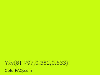 Yxy 81.797,0.381,0.533 Color is a normal lime color and the nearest color is Arctic Lime #d0ff14. Hex code #c7fc10 and RGB value is rgb(199,252,16). In RGB color space, this color is composed of 78% red, 99% green, 6% blue, In CMYK color space, this color is composed of 21% cyan, 0% magenta, 94% yellow , 1% black , In HSL color space, this color has a hue angle of 73° , 98% saturation and 53% lightness.