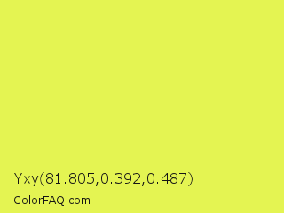 Yxy 81.805,0.392,0.487 Color is a light yellow color and the nearest color is Starship #ecf245. Hex code #e4f452 and RGB value is rgb(228,244,82). In RGB color space, this color is composed of 89% red, 96% green, 32% blue, In CMYK color space, this color is composed of 7% cyan, 0% magenta, 66% yellow , 4% black , In HSL color space, this color has a hue angle of 66° , 88% saturation and 64% lightness.
