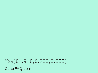 Yxy 81.918,0.283,0.355 Color is a very light green color and the nearest color is Ice Cold #b1f4e7. Hex code #b1f8e1 and RGB value is rgb(177,248,225). In RGB color space, this color is composed of 69% red, 97% green, 88% blue, In CMYK color space, this color is composed of 29% cyan, 0% magenta, 9% yellow , 3% black , In HSL color space, this color has a hue angle of 161° , 84% saturation and 83% lightness.