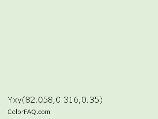 Yxy 82.058,0.316,0.35 Color is a very light green color and the nearest color is Willow Brook #dfecda. Hex code #e0eeda and RGB value is rgb(224,238,218). In RGB color space, this color is composed of 88% red, 93% green, 85% blue, In CMYK color space, this color is composed of 6% cyan, 0% magenta, 8% yellow , 7% black , In HSL color space, this color has a hue angle of 102° , 37% saturation and 89% lightness.