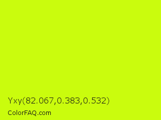 Yxy 82.067,0.383,0.532 Color is a normal lime color and the nearest color is Arctic Lime #d0ff14. Hex code #cafc0d and RGB value is rgb(202,252,13). In RGB color space, this color is composed of 79% red, 99% green, 5% blue, In CMYK color space, this color is composed of 20% cyan, 0% magenta, 95% yellow , 1% black , In HSL color space, this color has a hue angle of 73° , 98% saturation and 52% lightness.
