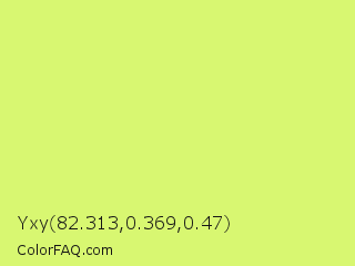 Yxy 82.313,0.369,0.47 Color is a light lime color and the nearest color is Booger Buster #dde26a. Hex code #d8f771 and RGB value is rgb(216,247,113). In RGB color space, this color is composed of 85% red, 97% green, 44% blue, In CMYK color space, this color is composed of 13% cyan, 0% magenta, 54% yellow , 3% black , In HSL color space, this color has a hue angle of 74° , 89% saturation and 71% lightness.