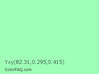 Yxy 82.31,0.295,0.415 Color is a very light green color and the nearest color is Teal Deer #99e6b3. Hex code #9effb7 and RGB value is rgb(158,255,183). In RGB color space, this color is composed of 62% red, 100% green, 72% blue, In CMYK color space, this color is composed of 38% cyan, 0% magenta, 28% yellow , 0% black , In HSL color space, this color has a hue angle of 135° , 100% saturation and 81% lightness.
