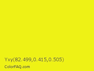Yxy 82.499,0.415,0.505 Color is a normal yellow color and the nearest color is Broom #ffec13. Hex code #eff315 and RGB value is rgb(239,243,21). In RGB color space, this color is composed of 94% red, 95% green, 8% blue, In CMYK color space, this color is composed of 2% cyan, 0% magenta, 91% yellow , 5% black , In HSL color space, this color has a hue angle of 61° , 90% saturation and 52% lightness.