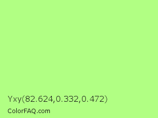 Yxy 82.624,0.332,0.472 Color is a light green color and the nearest color is Sulu #c1f07c. Hex code #b1ff83 and RGB value is rgb(177,255,131). In RGB color space, this color is composed of 69% red, 100% green, 51% blue, In CMYK color space, this color is composed of 31% cyan, 0% magenta, 49% yellow , 0% black , In HSL color space, this color has a hue angle of 98° , 100% saturation and 76% lightness.