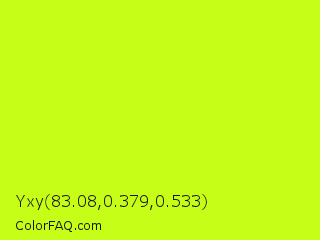 Yxy 83.08,0.379,0.533 Color is a normal lime color and the nearest color is Arctic Lime #d0ff14. Hex code #c7fe17 and RGB value is rgb(199,254,23). In RGB color space, this color is composed of 78% red, 100% green, 9% blue, In CMYK color space, this color is composed of 22% cyan, 0% magenta, 91% yellow , 0% black , In HSL color space, this color has a hue angle of 74° , 99% saturation and 54% lightness.