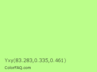 Yxy 83.283,0.335,0.461 Color is a light green color and the nearest color is Sulu #c1f07c. Hex code #bbfe8a and RGB value is rgb(187,254,138). In RGB color space, this color is composed of 73% red, 100% green, 54% blue, In CMYK color space, this color is composed of 26% cyan, 0% magenta, 46% yellow , 0% black , In HSL color space, this color has a hue angle of 95° , 98% saturation and 77% lightness.