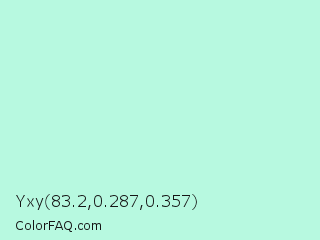 Yxy 83.2,0.287,0.357 Color is a very light green color and the nearest color is Ice Cold #b1f4e7. Hex code #b7f9e0 and RGB value is rgb(183,249,224). In RGB color space, this color is composed of 72% red, 98% green, 88% blue, In CMYK color space, this color is composed of 27% cyan, 0% magenta, 10% yellow , 2% black , In HSL color space, this color has a hue angle of 157° , 85% saturation and 85% lightness.