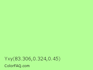 Yxy 83.306,0.324,0.45 Color is a light green color and the nearest color is Reef #c9ffa2. Hex code #b4ff96 and RGB value is rgb(180,255,150). In RGB color space, this color is composed of 71% red, 100% green, 59% blue, In CMYK color space, this color is composed of 29% cyan, 0% magenta, 41% yellow , 0% black , In HSL color space, this color has a hue angle of 103° , 100% saturation and 79% lightness.