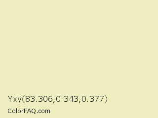 Yxy 83.306,0.343,0.377 Color is a very light yellow color and the nearest color is Mint Julep #f1eec1. Hex code #efeec0 and RGB value is rgb(239,238,192). In RGB color space, this color is composed of 94% red, 93% green, 75% blue, In CMYK color space, this color is composed of 0% cyan, 0% magenta, 20% yellow , 6% black , In HSL color space, this color has a hue angle of 59° , 59% saturation and 85% lightness.
